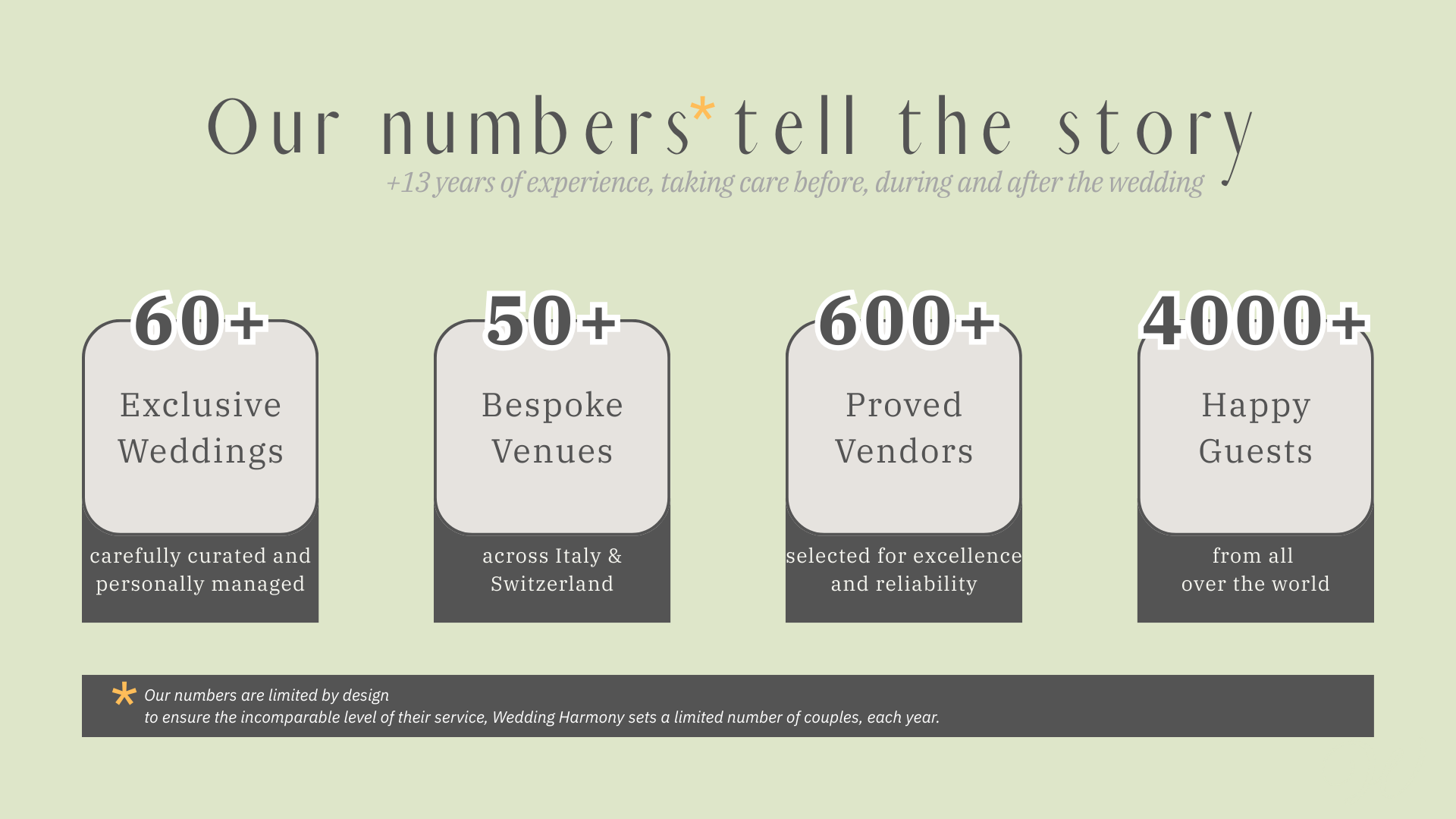 Mein solides und hochprofessionelles Netzwerk in Italien und in der Schweiz ermöglicht es mir, jedem Hochzeitstag einen individuellen und einzigartigen Rahmen zu verleihen, der die Einzigartigkeit und Schönheit der Liebe feiert.